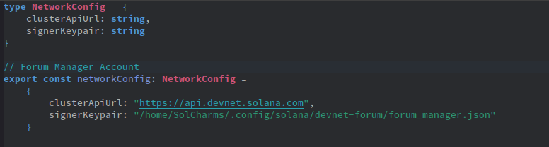 The network configuration (../config\_devnet/networkConfig-devnet.ts) is necessary right away. We will first set up the configuration from the perspective of someone who will initialize and manage a forum (later we will also do it from the perspective of other users). Two inputs are required: