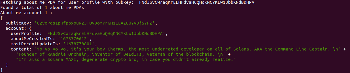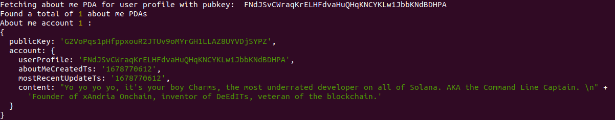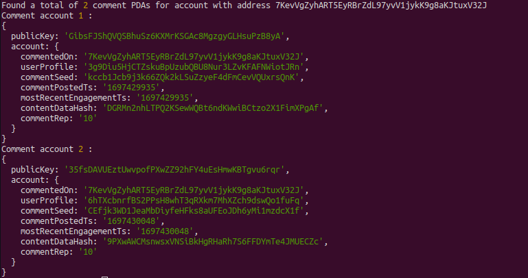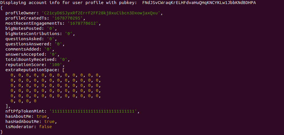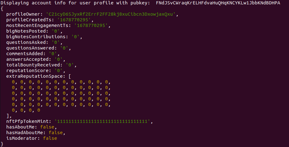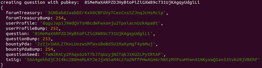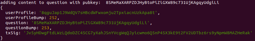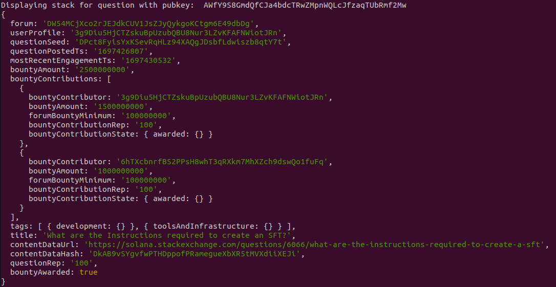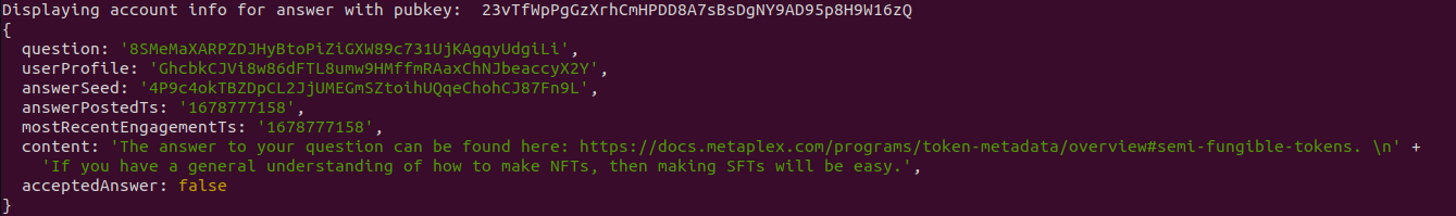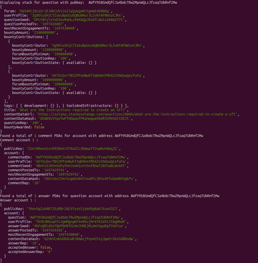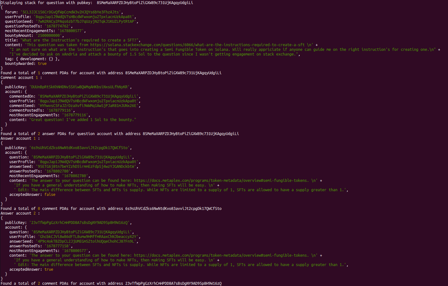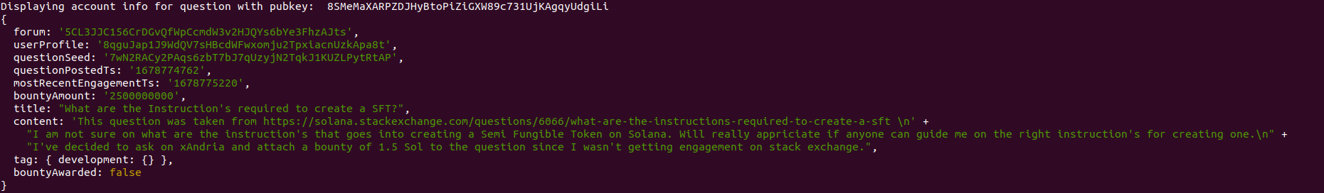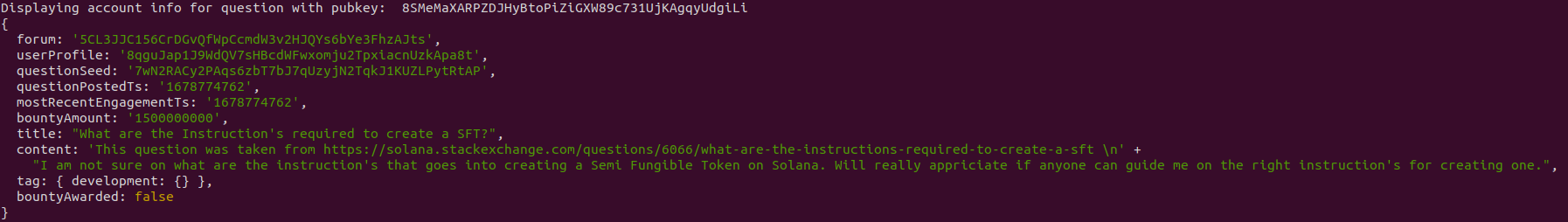 We can fetch the question either by fetching all questions for a given user profile or by the question account's pubkey. Here, running
