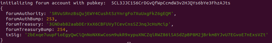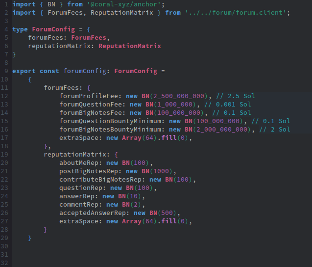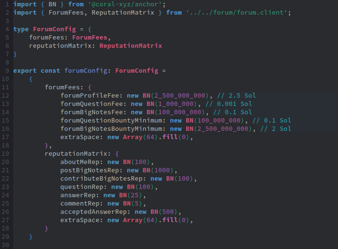 The forum is where all the business takes place. It is an account that stores all the data needed protocol-wide. To initialize a forum account, one must decide on all the protocol fees and all the ways reputation can be earned. To configure a forum, we need to input all the required parameters into the config file (../config\_devnet/forumConfig-devnet.ts). Here's mine: