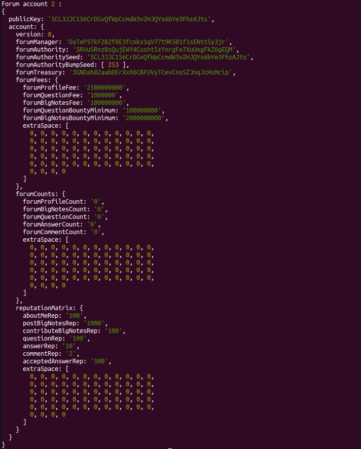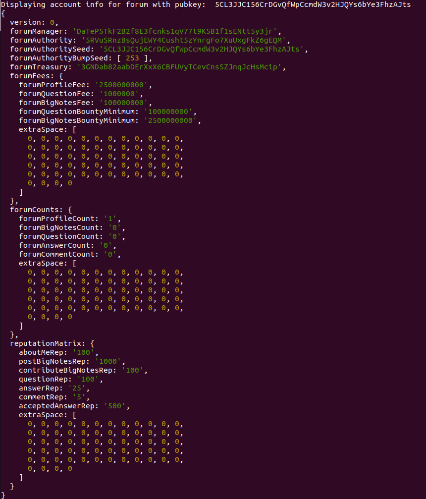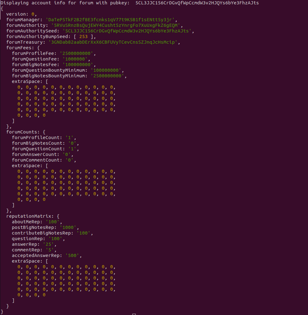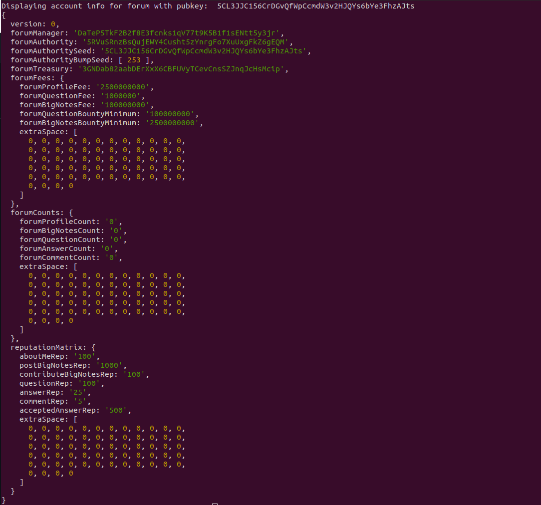 where mine correctly states that there are 2 forum accounts (one from prior testing). We see all chosen fee and reputation parameters reflected in the account's data.