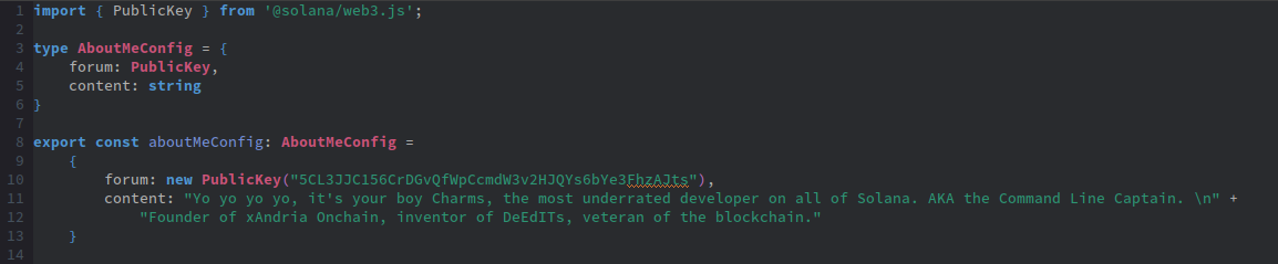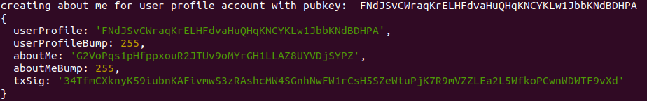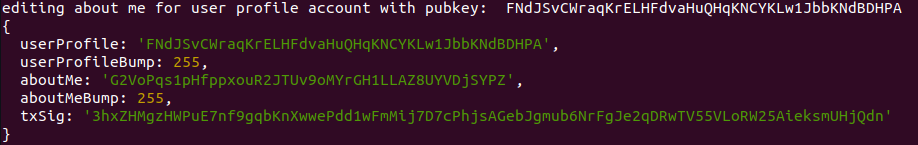 The next step after a user's profile has been created is to create an 'about me'. This first requires configuring the file (../config\_devnet/aboutMeConfig-devnet.ts) to add the necessary about me text
