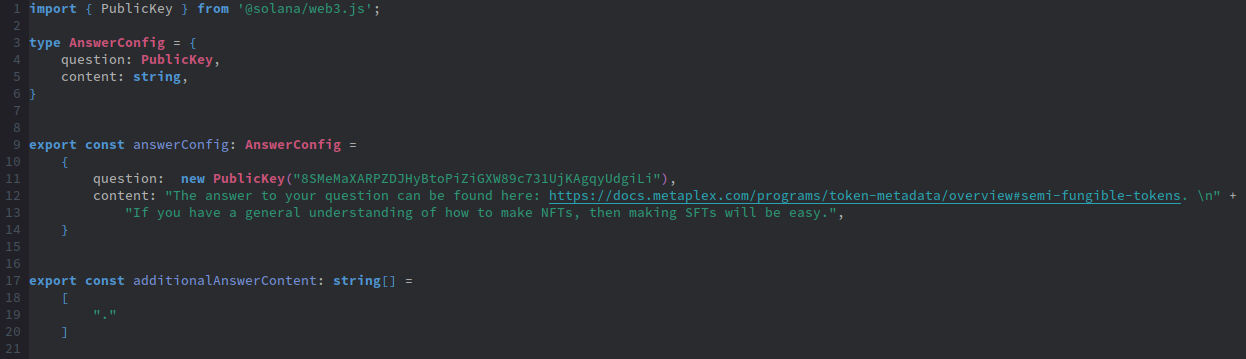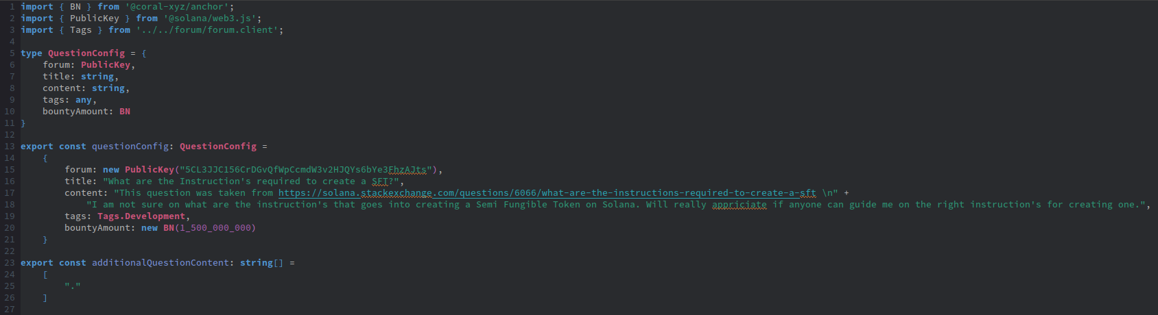 To ask a question on the forum, we must first configure the question config file (../config\_devnet/questionConfig-devnet.ts). I've gone ahead and grabbed a question off of solana stack exchange as an homage to the inspiriation for xAndria. Here's what the config looks like: